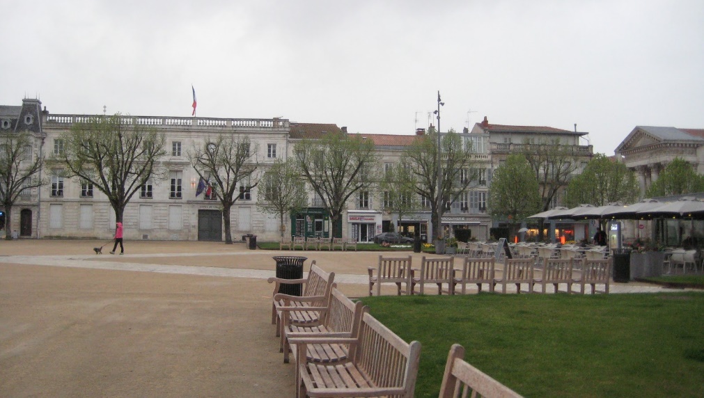 Main square of Rochefort, France. Note pointed roof and columns of the church of St. Louis to the right of the square.