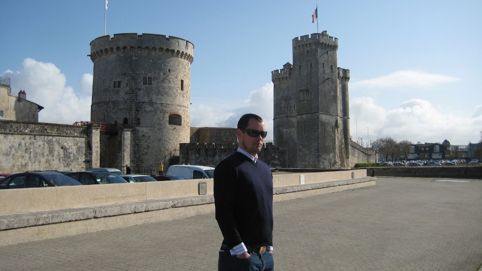 Jacob Violet between the two towers of La Rochelle, France.