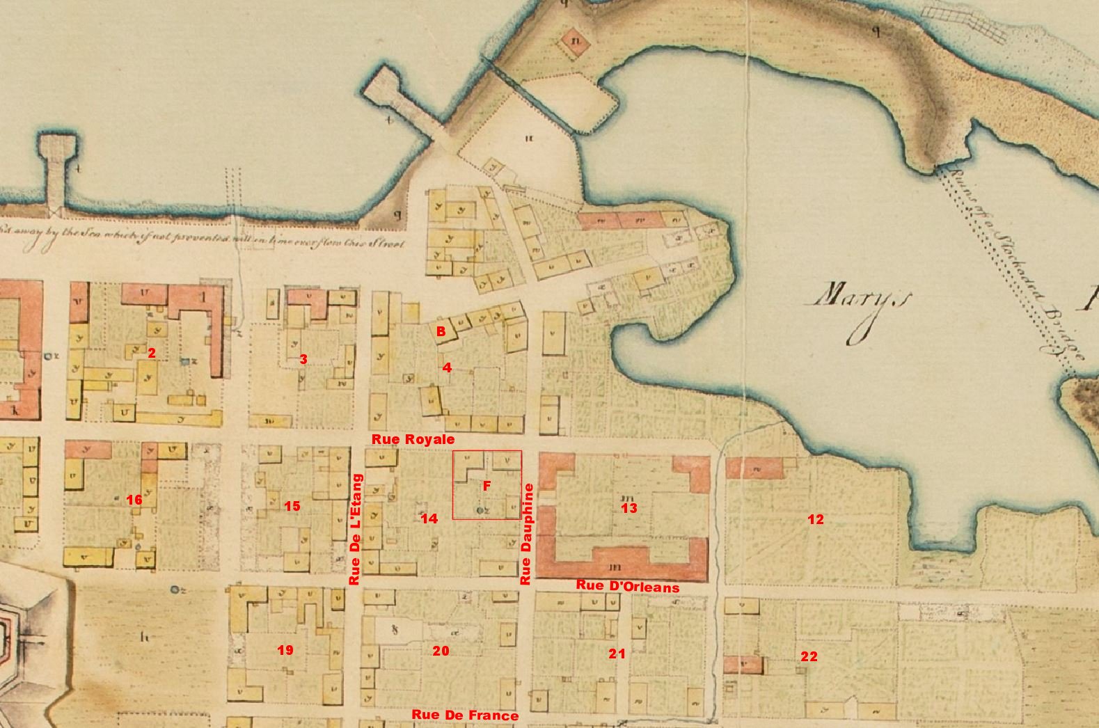 Eric Krause, who once held the position of Historical Records Supervisor at the Fortress of Louisbourg, wrote many research papers and it was in his 2000-151 paper where I found that Francois Poinsu had owned Lot F in Block 14. When you compare the shape of the buildings on Lot F, Block 14 between the 1745 (Figure 1) and the 1767 (Figure 2) maps (red labeling added by author), it becomes obvious that the shape of the buildings on Lot F, Block 14 has changed. What I cannot be clear about, is which building in Lot F was the “new house of Madame Poinsu” mentioned in the agreement. If I was to guess, I would think it was the one on the corner, what do you think?