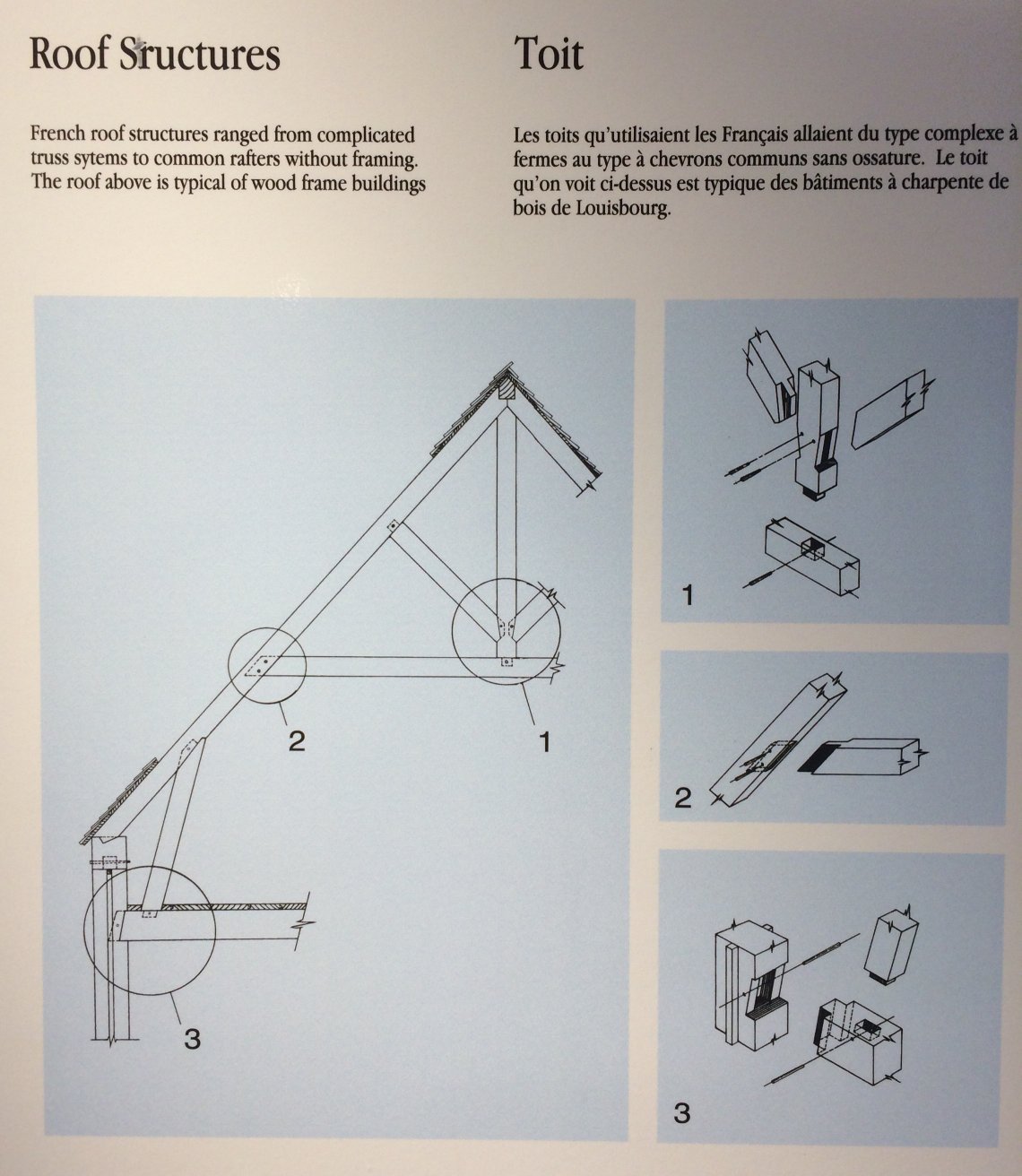 Probably, more of interest to us is how the roofs were made; see Figure 6 which is a photo of an interpretive panel at Louisbourg, which shows a typical Louisbourg roof constructed using the charpente interlocking joint method.