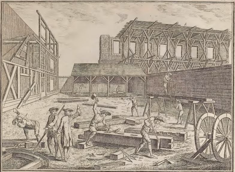 Figure 4. Woodcut showing Charpente timbers being cut: Courtesy Recuel de Planches