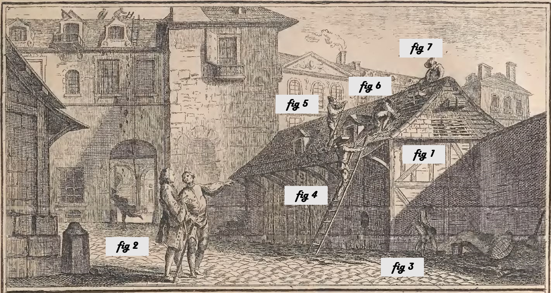 For a brief explanation of the work of a Couvreur (roofer) I turned to “Dictonnaire des Arts et Metiers” which is “Dictionary of Arts and Trades”, written by Phillippe Macquer and published in 1766 by Yverdon. The dictionary explains that a Couvreur is one of the many craftsmen, along with masons, carpenters and others, who work for an architect and builds buildings according the architect’s plans. A little different than today where a building contractor would hire the craftsmen, better known today as “trades”, to build a building in accordance with the plans drawn up by the architect.